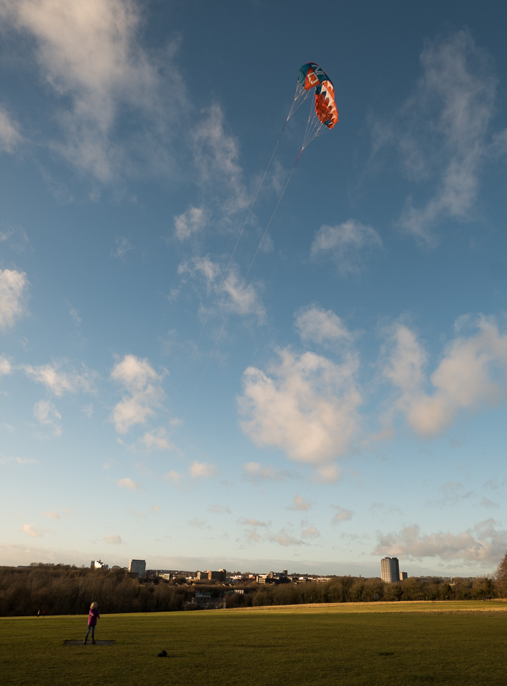 Its an indestructible Peter Lynn Uniq, being single skinned it cant pop like a 6ft Flexi can. It only needs small pulls to move it about and it seems very fast in its upper wind speeds, so it should be fun!